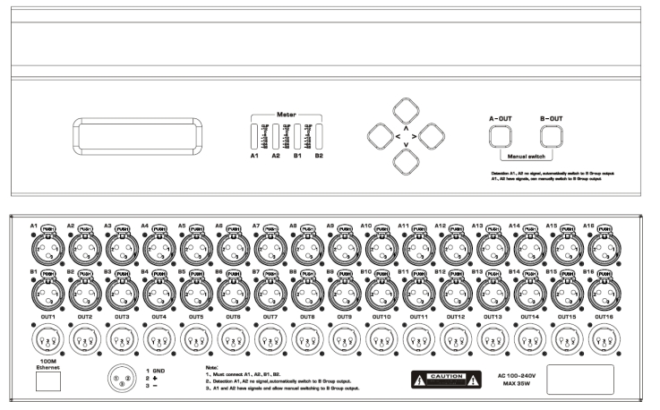 20路信号输出(主输出L,R, 14路AUX1-14辅助输出,1路立体声耳机监听输出,AES输出)